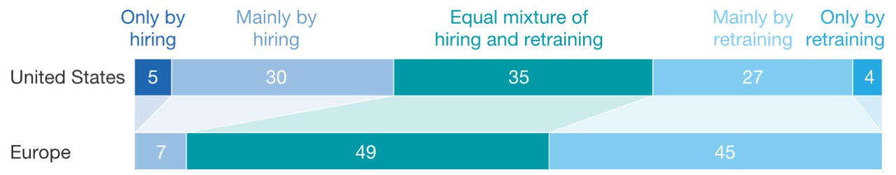 35% компаний в США собираются улучшать профиль навыков рабочей силы исключительно или преимущественно за счёт найма, тогда как в Европе такую стратегию выбирают всего 7% компаний.