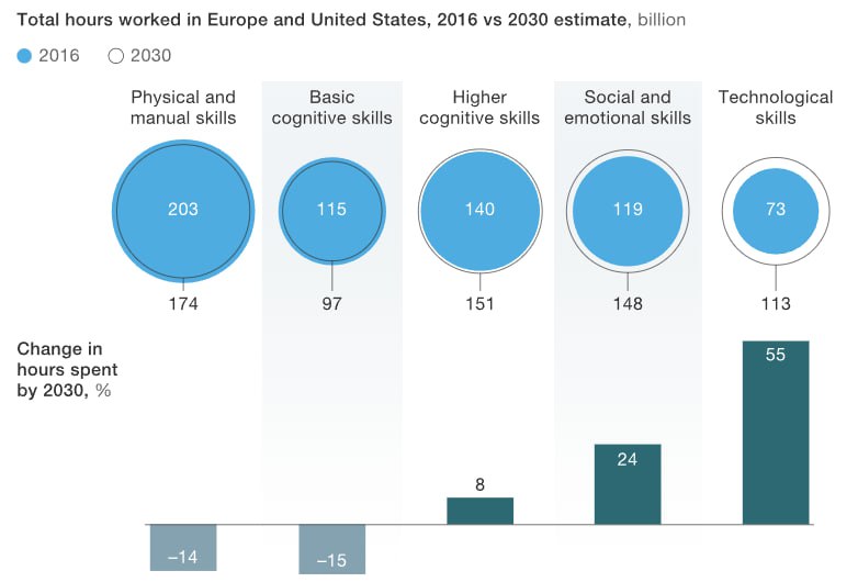 Спрос смещается в сторону высших когнитивных навыков. Наше исследование показывает переход от деятельности, требующей лишь базовых когнитивных навыков, к деятельности, использующей высокие когнитивные функции. Спрос на такие навыки, как креативность, критическое мышление, принятие решений и обработка сложной информации, будет расти до 2030 года — на 19% в США и на 14% в Европе. При этом виды деятельности, требующие только простых когнитивных навыков (например, базовой грамотности и арифметики), будут сокращаться по мере автоматизации. Особенно сильно автоматизация затронет ввод и обработку данных, снижение составит 19% в США и 23% в Европе в период 2016–2030 годов. Снижение произойдёт почти во всех отраслях, поскольку машины будут все чаще заменять простые операции ввода информации.